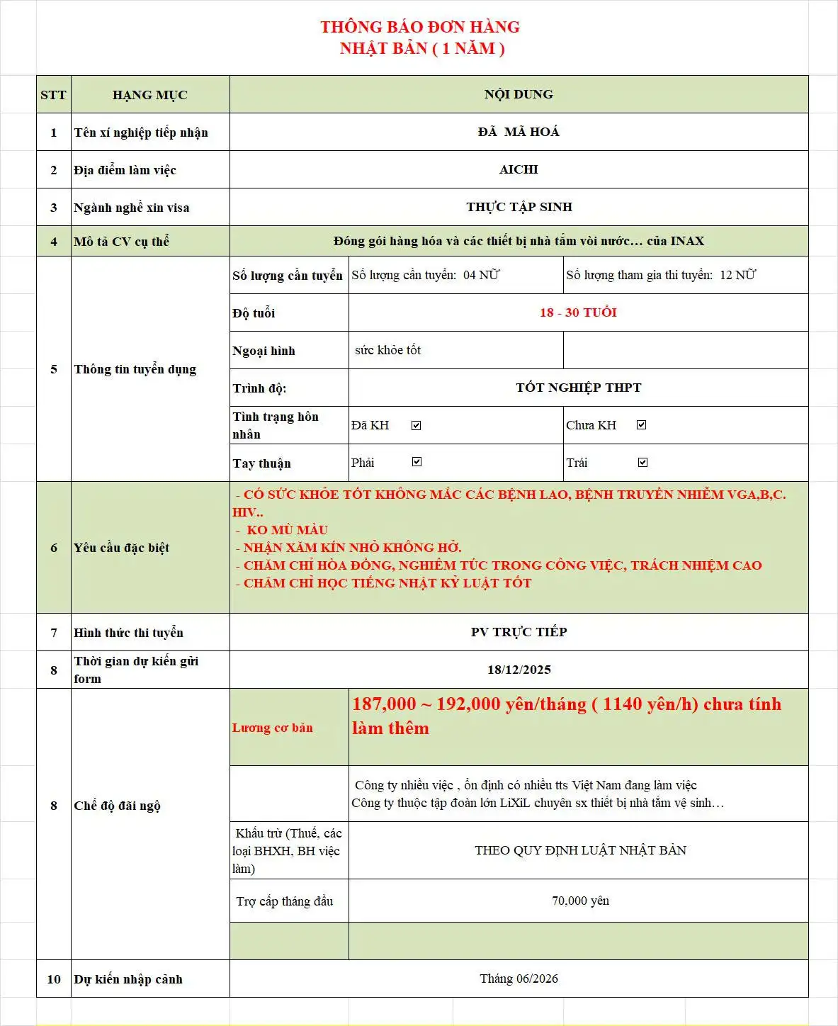Lương cơ bản: Dao động từ 187.000 đến 192.000 Yên/tháng (chưa tính tăng ca).