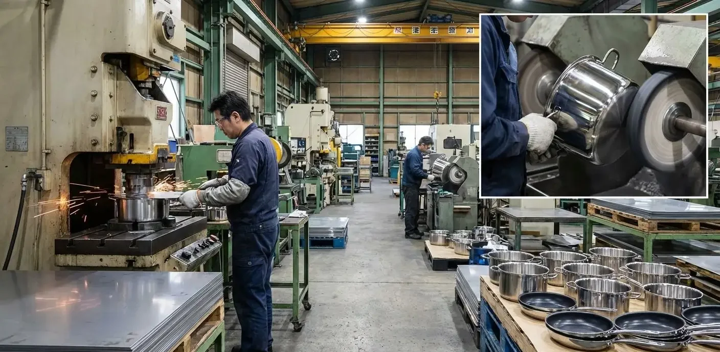 Công việc này đòi hỏi sự khéo léo và sức bền, tham gia vào quy trình biến những tấm thép vô tri thành những bộ xoong nồi cao cấp sáng bóng.