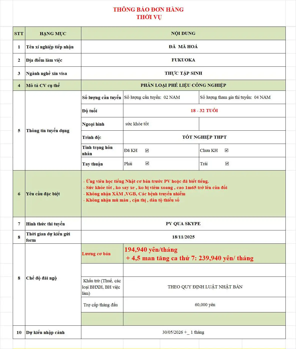 Nếu bạn có sức khỏe tốt, sự chăm chỉ và mong muốn một công việc ổn định, có ý nghĩa tại Nhật Bản, đơn hàng phân loại phế liệu công nghiệp tại Fukuoka này chính là cơ hội vàng dành cho bạn.