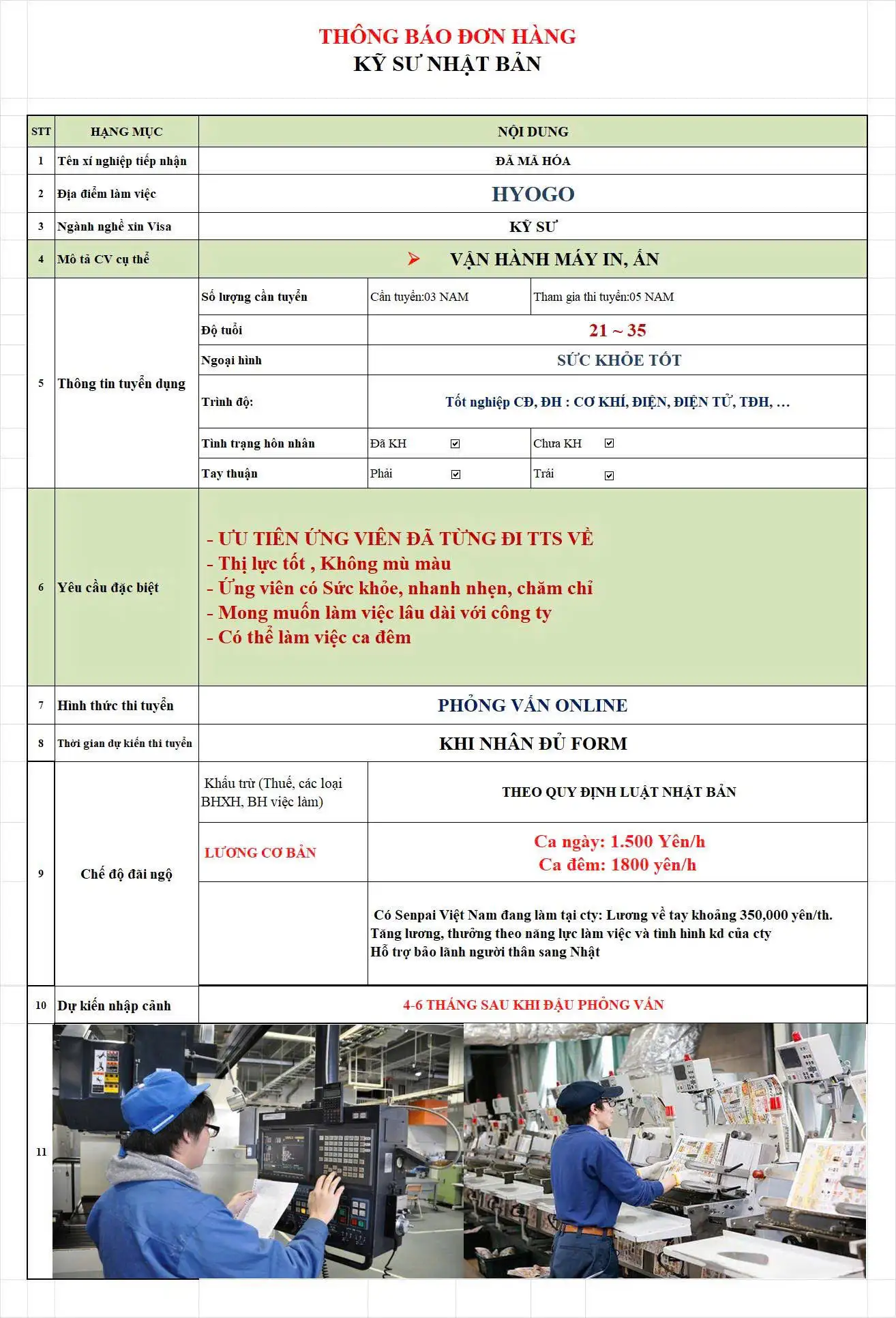 Nếu bạn có niềm đam mê với kỹ thuật, sự tỉ mỉ và mong muốn một công việc ổn định, phát triển sự nghiệp tại Nhật Bản, đơn hàng vận hành máy in, ấn tại Hyogo này chính là cơ hội vàng dành cho bạn. Hãy ứng tuyển ngay hôm nay để trở thành một phần của ngành công nghiệp đầy tiềm năng này!