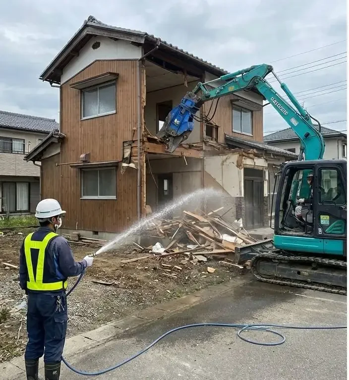 Hỗ trợ phá dỡ bằng máy: Khi máy xúc (có gắn kềm cắt) phá dỡ khung nhà, bạn sẽ đứng ở dưới để xịt nước giảm bụi và hỗ trợ thu gom các mảng vật liệu rơi xuống.