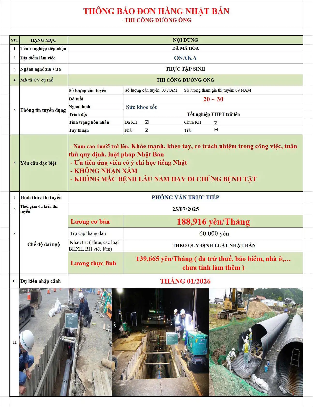 Nếu bạn là một người thợ có tay nghề vững vàng, sự tỉ mỉ và mong muốn một công việc ổn định, phát triển sự nghiệp trong ngành thi công đường ống tại Nhật Bản, đơn hàng này tại Osaka chính là cơ hội vàng dành cho bạn. Hãy ứng tuyển ngay hôm nay để góp phần tạo nên những công trình bền vững và hiệu quả!